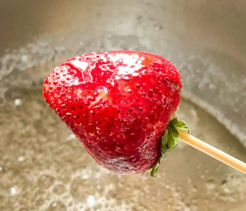 이수시개에 꽂힌 과일을 시럽 그릇에 넣어 앞뒤로 잘 묻혀줍니다. 가스레인지처럼 약불에 식지 않게 데우는 방식이 아니므로 최대한 빠른 시간 내에 과일에 시럽을 묻혀 주되 혹시 시간이 부족하여 시럽이 굳어 간다면 임시방편이긴 하지만 1회 차 정도 10초~15초 정도 재 가열 하여 사용합니다. 하지만 지나친 재가열은 금물입니다. 시럽의 농도가 거칠어지고 수분기가 없어져 점점 과일에 도포하기가 힘이 듭니다.